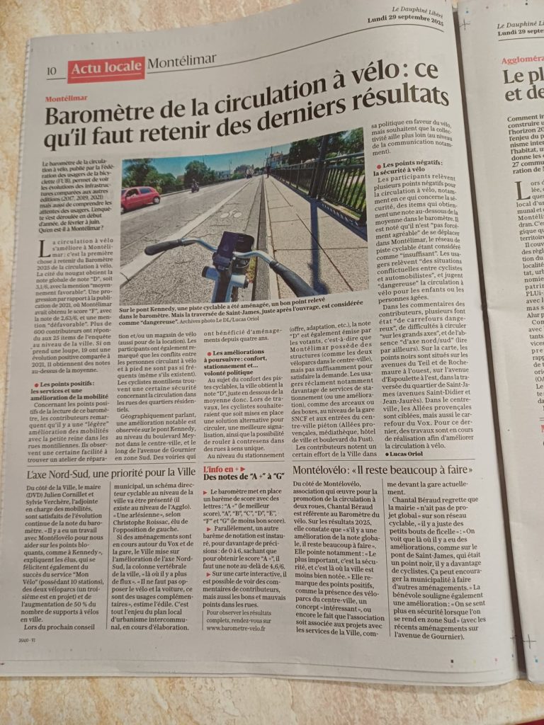 Ci-dessous un article paru dans le Dauphiné Libéré qui revient sur les résultats de l’enquête nationale de la circulation à vélo pour la ville de Montélimar.